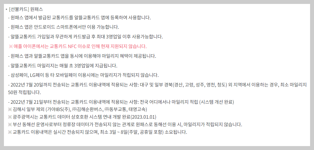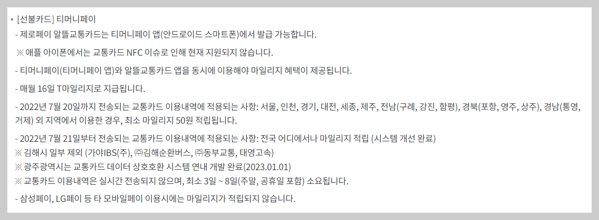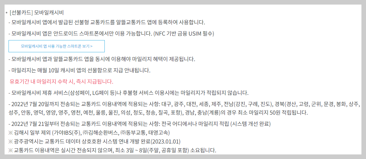 선불 알뜰교통카드 티머니페이, 모바일캐시비, 원패스 카드 마일리지 적립방식은 다음과 같습니다.
