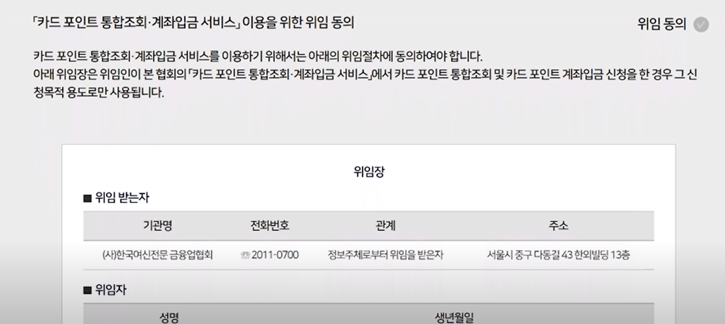 로그인 한 후에 카드 포인트 통합조회 및 계좌입금 서비스 이용을 위한 위임 동의란에 체크를 합니다. 맨 위 오른쪽에 보시면 위임동의 체크란이 있습니다. 위임 동의가 끝이나면 카드사를 확인 할 수 있는 창으로 바뀌어집니다.