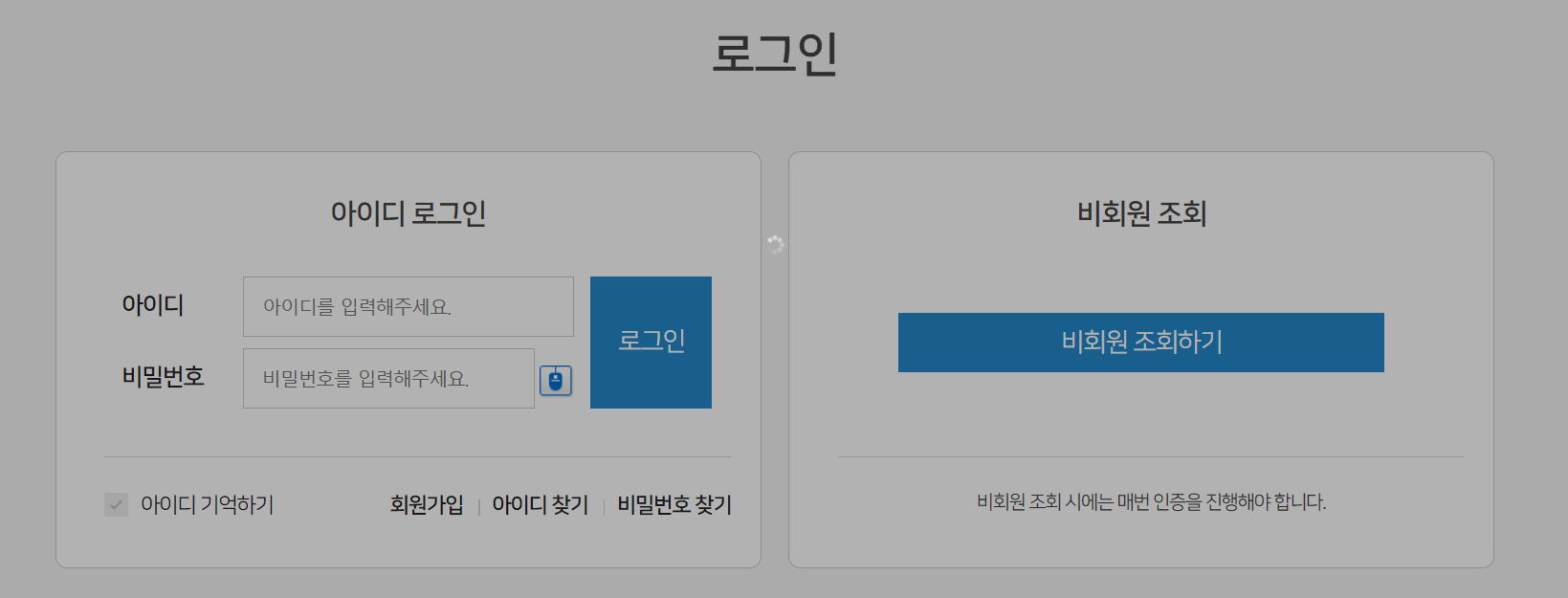 로그인 방식은 두가지 인데, 회원가입을 하고나서 왼쪽 아이디 로그인을 하셔도 좋고, 회원가입을 하지 않고 조회만 해보고 싶다 하시는 분들은 왼쪽 비회원 조회를 클릭하시면 됩니다. 다만 비회원 조회를 할 시 매번 본인 인증을 해야하는 부분이 있습니다. 참고로 휴대폰을 가깝게 소지하고 계시다면 휴대폰 인증이 편리합니다.