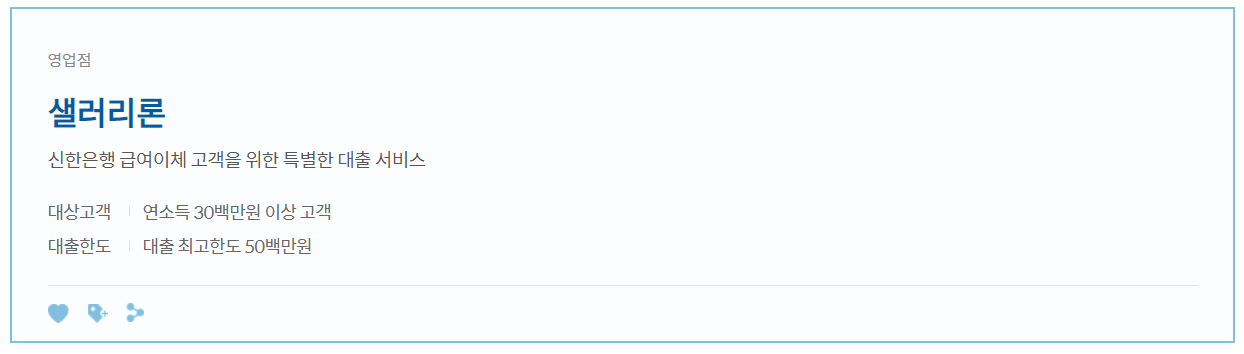 신한은행에서 비교적 금리가 적은 신용대출인 '샐러리론'의 상세내용입니다. 신한은행을 거래하는 급여이체 고객 전용 신용대출상품이며 재직업체 및 재직기간에 상관없이 대출한도 및 대출금리를 우대해 주는 상품입니다. 단, 보험설계사, 학원강사 등 사업소득자는 대출대상에서 제외됩니다.